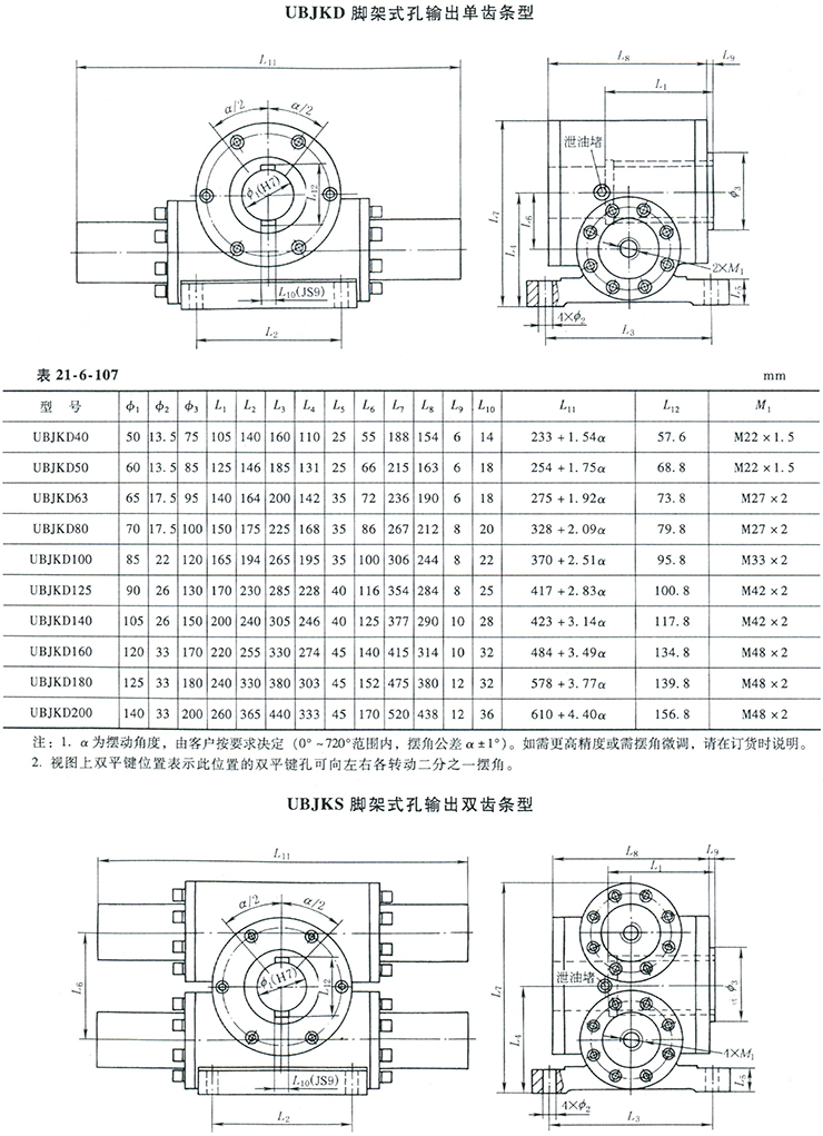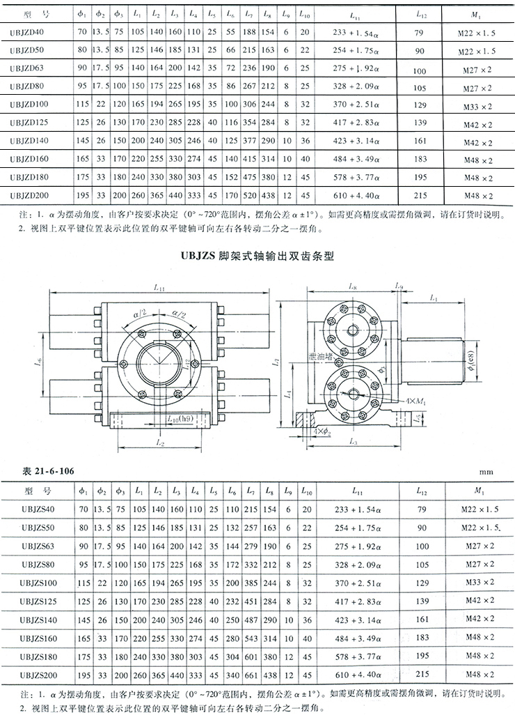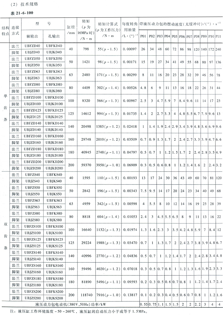 UB型齒輪齒條擺動油缸公稱壓力為16MPa,有單齒條和雙齒條兩種結(jié)構(gòu)型式;有法蘭式和腳架式兩種安裝方式;有軸和孔兩種輸出方式。